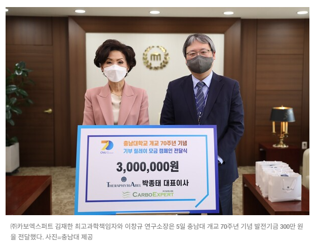 충남대학교기술지주 회사인 (주)카보엑스퍼트가 개교 70주년을 기념해 충남대학교에 발전기금을 기부했습니다.